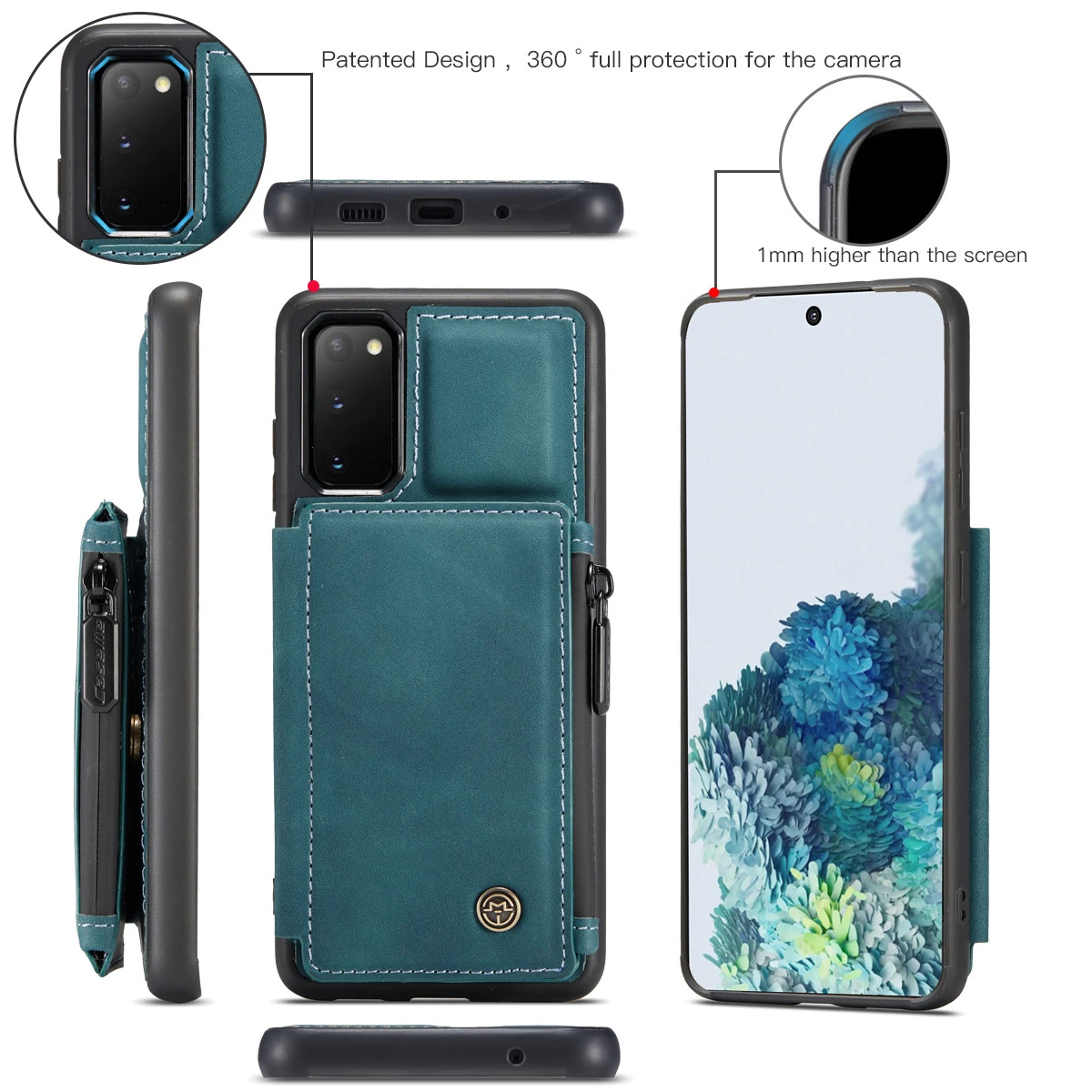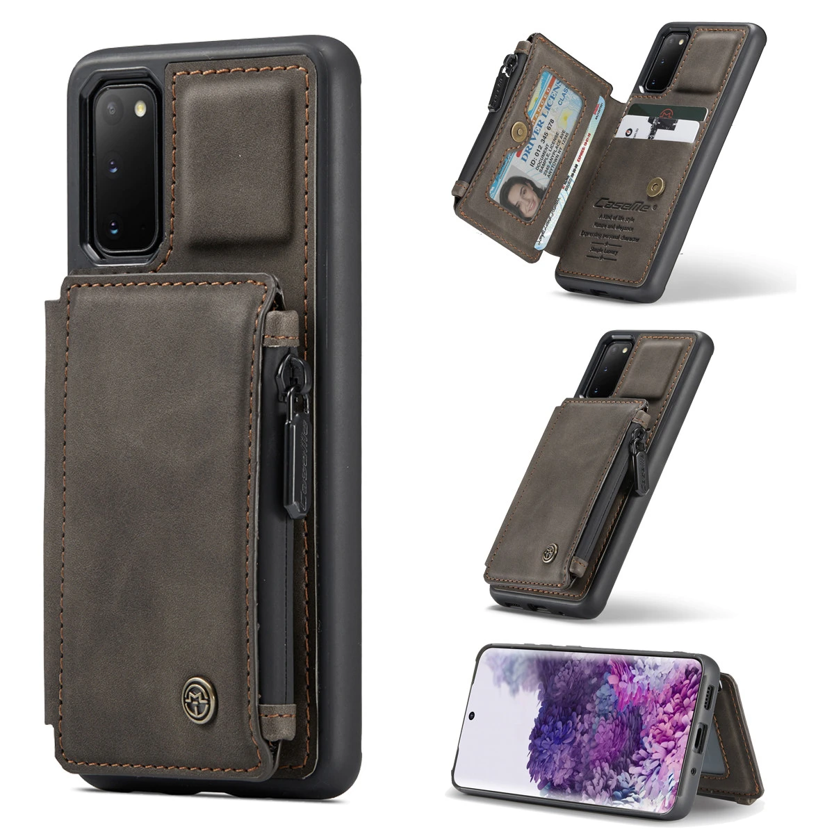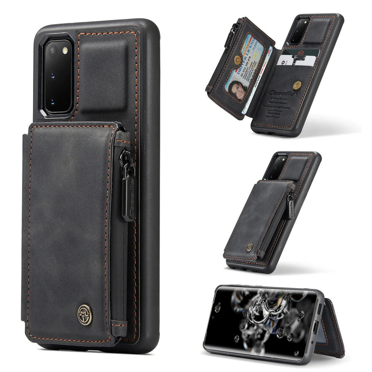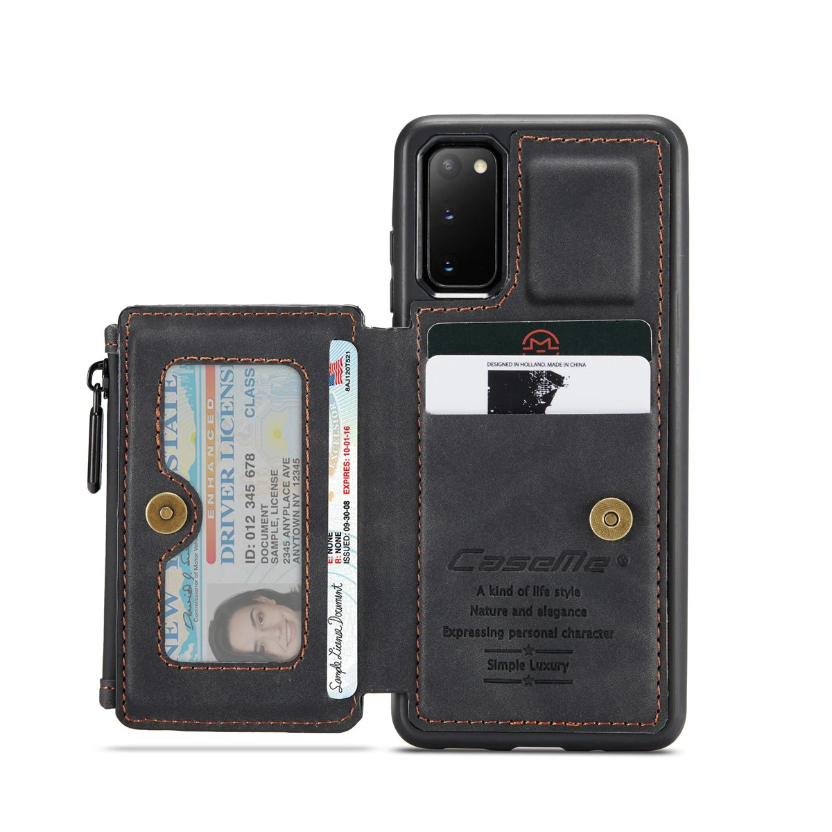 - Rugged shockproof phone case (no front cover) with a multi-function wallet. The wallet pocket attaches to the case with magnetic buttons.