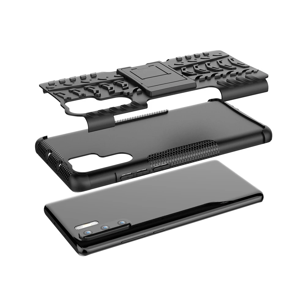 * 2-in-1 back soft rubber case and one hard plastic case on top of it. Well protects back and corners of the device. No front cover.