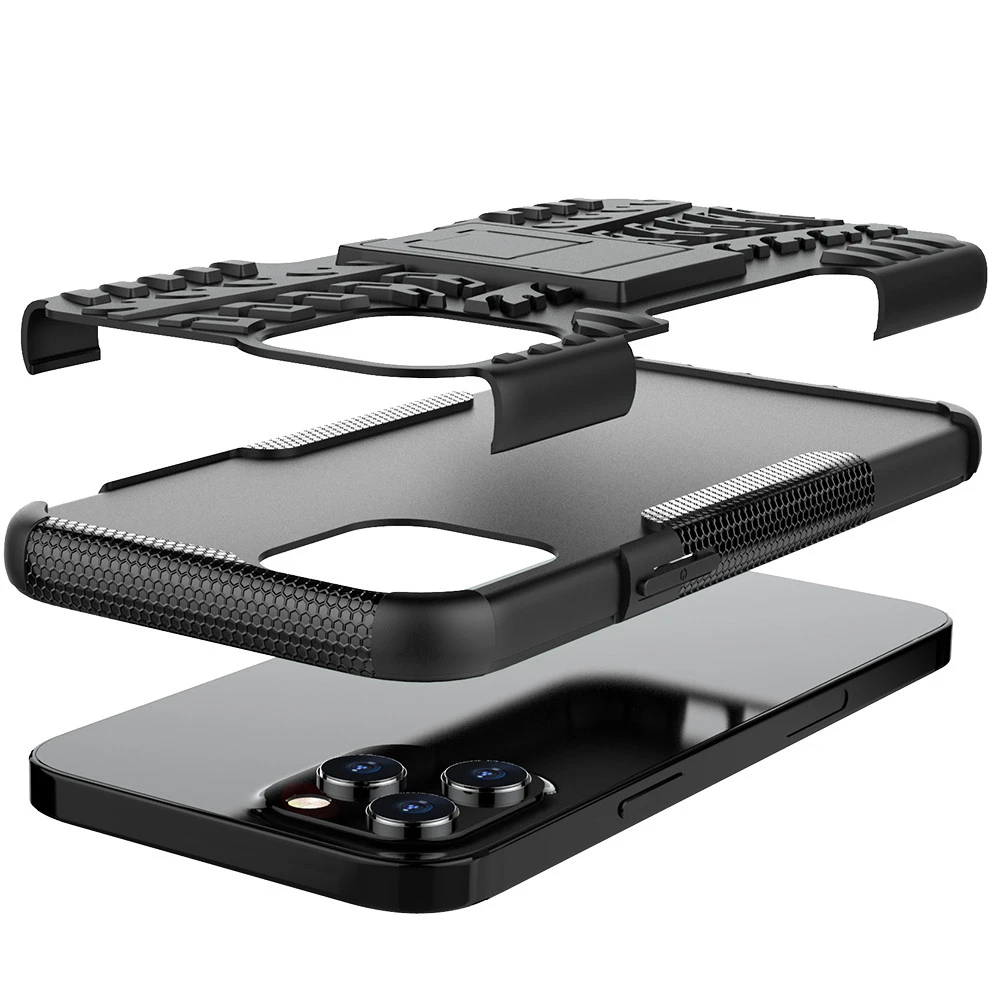 * 2-in-1 back soft rubber case and one hard plastic case on top of it. Well protects back and corners of the device. No front cover.