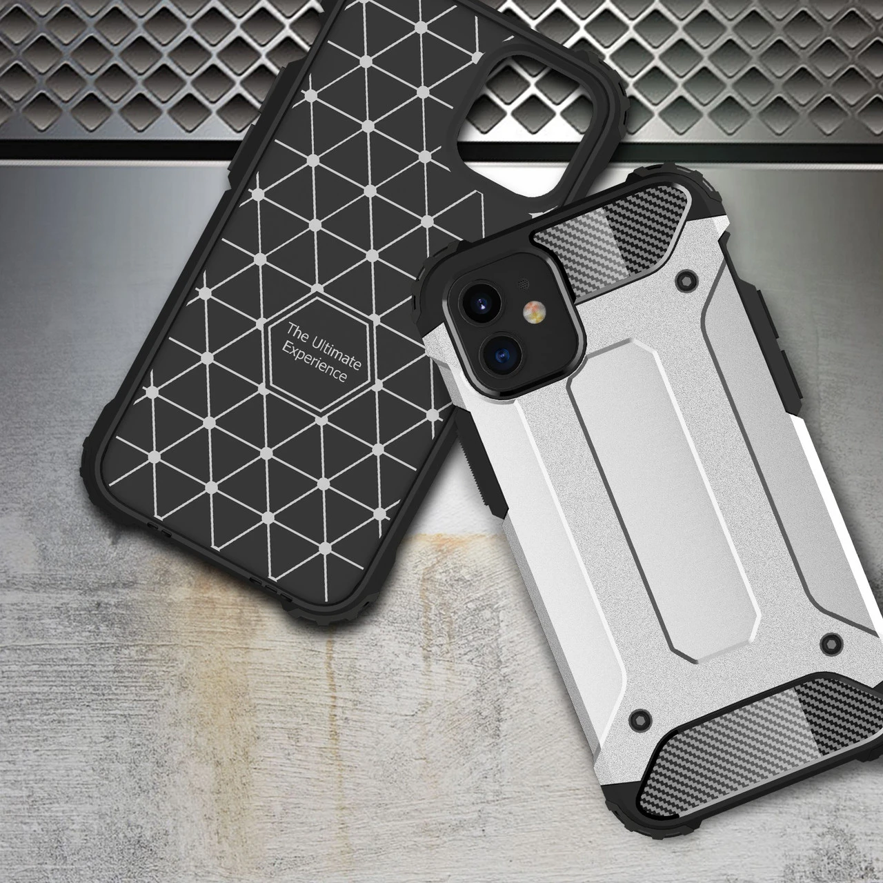 * 2-in-1 back soft rubber case and one hard plastic case on top of it. Tight fit. Well protects back and corners of the device. No front cover.