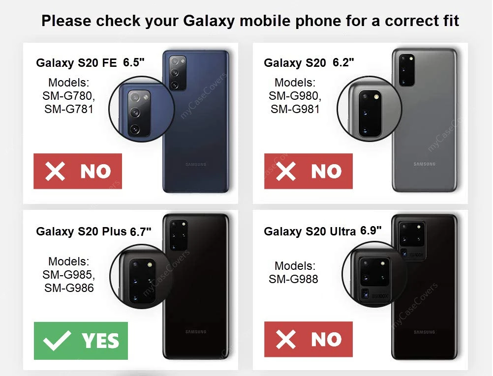 * Compatible with Samsung Galaxy S20+ 4G and 5G version (S20 Plus, released in 2020, Wifi, 4G LTE and 5G). Reference website here: https://www.gsmarena.com/samsung_galaxy_s20+-10080.php (4G), and https://www.gsmarena.com/samsung_galaxy_s20+_5g-10041.php (5G)