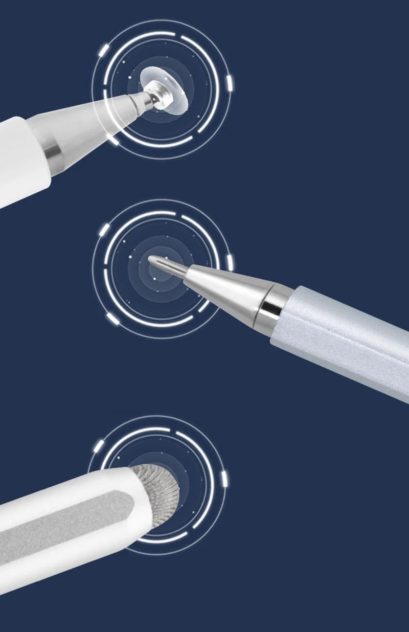 - 3-in-1 compact stylus: features 1x disc-tip, 1x fibre mesh tip, and 1x ballpoint pen.